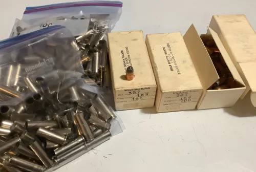 165.00 357 mag brass and bullets Jan 1, 2026 - 5:24 PM Josey94 300 pces Winchester 158 grn jacketed hollow point bullets ,along with 200 mixed nickel brass , sh