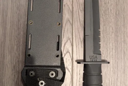 80.00 KA-BAR Tanto Black (1245) Jan 12, 2026 - 10:39 PM Cordite -8 inch Tanto blade 1095 steel -glass-filled nylon sheath -Made in the USA.