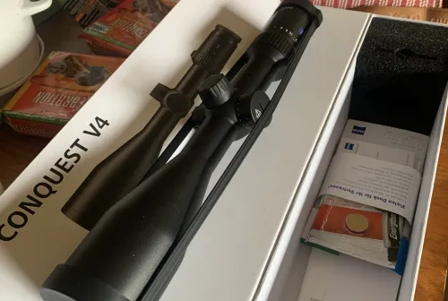 1300.00 Zeiss Conquest V4 3-12x56 illuminated Apr 12, 2026 - 9:08 AM Hawgripper “Brand New” Zeiss V4 in a 3-12x56 illuminated. Just out of box for pic’s.