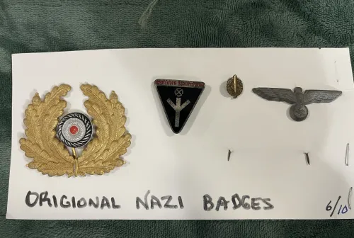 500.00 Authentic WWII Nazi Stick Pins and Hat Cockade Mar 7, 2026 - 3:22 PM JamesD80 Up for sale are my 4 Authentic Nazi Stick pins and Officer's hat Badge