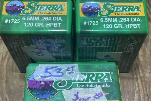 70.00 6.5 - .260 cal bullets Sep 15, 2025 - 10:46 AM Chickenpoxcharlie Four full boxes of Sierra Part # 1725 120 grains $70 a box, part box $35