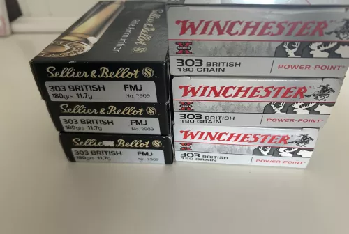 250.00 303 British Ammo Oct 3, 2025 - 1:20 PM TKB 3 boxes of Winchester super X 180gr SP, 3 boxes of sellier & bellot 180gr FMJ