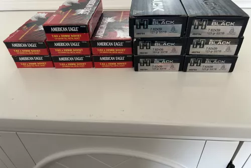 240.00 Hornady/American eagle 7.62x39 Oct 3, 2025 - 11:56 AM TKB 6 boxes of Hornady 7.62x39 SST 123gr- $40 per box SPF