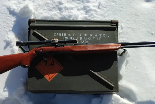 475.00 JC Higgins Model 30 package Dec 14, 2025 - 12:07 PM Jason1978 Semi auto 22. Tube fed. Original scope. Has unique, red, seatbelt style sling.