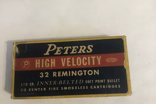 95.00 Vintage Original (Box)Peters High Velocity Shells. Cal. 32 Remington, 170 Grain, lnner-Belted Soft Point. (RARE) Nov 28, 2025 - 5:10 PM poor man jack Vintage Original (Box) Peters High Velocity Shells. Cal.