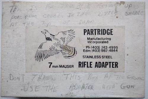 40.00 Partridge Cartridge 7mm Mauser 7x57 subsonic cartridge adapter kit Jan 15, 2026 - 8:25 AM Gorbie Thje original Partridge Cartridge, developed and handmade by a couple of hunters in Alberta.