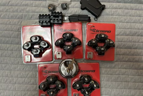 75.00 Box of Stuff Sep 16, 2025 - 9:24 PM McPhlyGuy Trigger locks x 20 $40 Padlock $5 Shotgun barrel pic rails x 2 $10 each