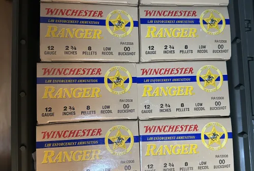 375.00 Winchester Ranger 8 Pellet 12 Gauge 00 Buck Jan 11, 2026 - 9:50 PM McPhlyGuy 250 rds (10 boxes of 25) of Winchester Ranger Low Recoil 8 Pellet 12 Gauge 00 Buckshot.