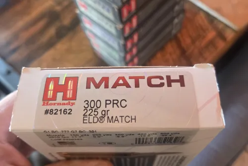 110.00 One box of Hornaday MATCH 225gr 300prc Mar 13, 2026 - 4:31 PM Longhorn As the title states 20rds of Hornaday Match 225 ELD-M 300 PRC $110