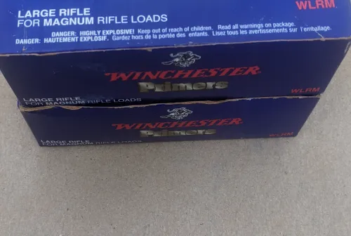 SOLD 150.00 Large rifle primers one full brick one half brick Apr 27, 2026 - 9:14 AM RocknandReeln One full brick(1000) one half brick (500) Winchester wlrm primers
