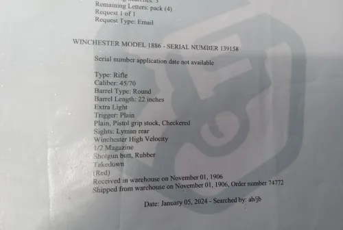 14000.00 Winchester1886 Dec 22, 2025 - 10:13 AM Harry Mero Winchester1886 Mfg'd 1906 in 45-70. 22" extra lite round barrel , take down , 1/2 mag.