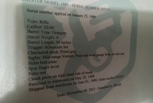 12000.00 Winchester 1885 Dec 22, 2025 - 9:56 AM Harry Mero Winchester Model 1885 Scheutzen, mfg'd in 1908.32-40 cal.