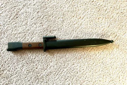 395.00 Belgian-made FN FAL Type A bayonet Dec 22, 2025 - 3:24 PM Terryhunter Belgian-made FN FAL Type A bayonet with original wood grips and large catch ring pommel.