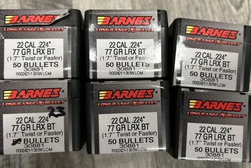 SOLD 225.00 77gr .224cal Barnes LRX bullets Dec 8, 2025 - 2:26 PM russm86 Have for sale 246x 77gr .224” Barnes LRX bullets. 4 boxes are new unopened.