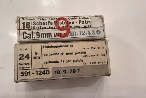 80.00 Vintage Swiss 9mm ammunition Jan 15, 2026 - 7:18 PM oolongwine Two boxes of vintage Swiss 9mm ammunition in good condition.