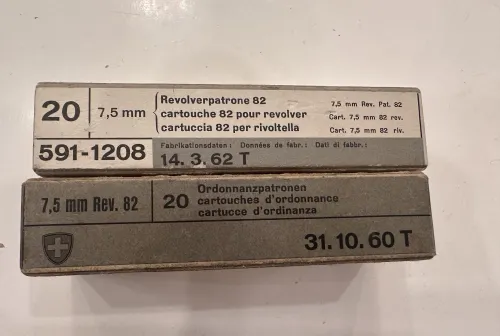 200.00 Swiss 7.5 Ordnance ammunition Jan 15, 2026 - 7:18 PM oolongwine Two boxes of vintage Swiss 7.5 Ordnance ammunition in good condition.