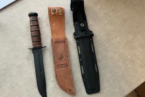 150.00 USMC KA-BAR knife Dec 12, 2025 - 12:05 PM Vintagestuff1994 Selling a new condition USMC KA-BAR knife, inclusing the original leather USMC sheath and the kyd