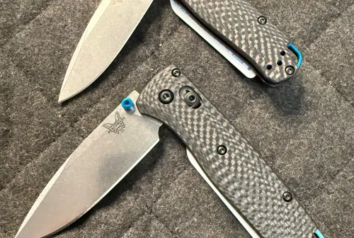 415.00 Benchmade Mini Bugout and Bugout With Carbon Fiber and S90V Nov 25, 2025 - 2:54 PM panzergunsandammo ALL BNIB, i have a a nice duo here with the bugout and mini bugout in S90V blade and carbon Fiber