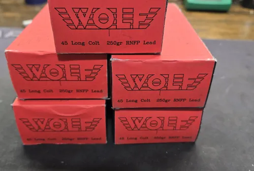 150.00 45 colt price drop Feb 6, 2026 - 3:28 PM mmcintyre1220 225 rounds (4 full, 1 half box) of wolf 45 colt. 250 grain lead.