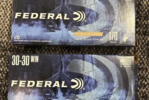 75.00 .30-30 Federal Powershok 170gr Feb 12, 2026 - 4:56 PM Ruffles One full box and one box with 17 rounds of Federal Powershok .30-30 170gr factory ammo.