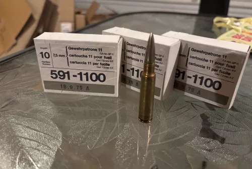 30.00 7.5x55 GP11 Swiss Army Surplus Ammo Sep 24, 2025 - 8:12 PM Skweezbox 31 rounds of 7.5x55 Gewehrpatrone 11 Swiss surplus ammo. Local pickup only.