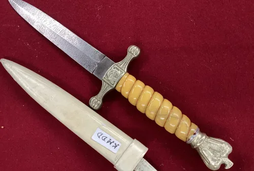 550.00 German Naval Dagger Feb 18, 2026 - 1:21 PM hgwt Full Damascus blade. Silver mounted. Swastika removed from pommel.
