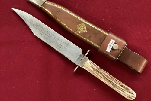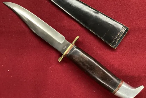 350.00 Vintage Bowie Knife Feb 18, 2026 - 1:01 PM hgwt Rare hollow ground blade. Very sharp. Contemporary replacement sheath.