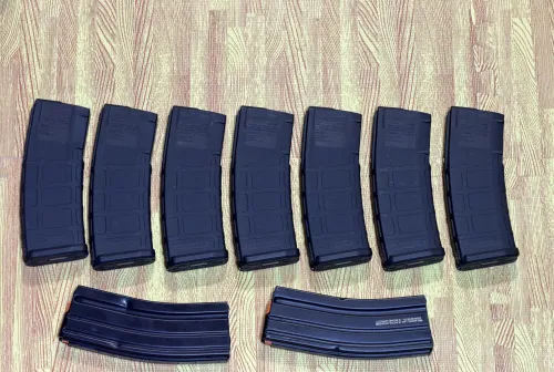 220.00 AR15 Magazine Lot Apr 26, 2026 - 9:06 AM Hardyshooter 7 Gen 2 Magpul PMAGS all pinned to 5, one generic metal mag pinned to 5, and one RRA LAR-15 pisto