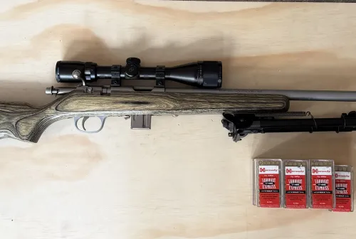 SOLD 850.00 Marlin 17hmr - pending Apr 23, 2026 - 10:18 AM Prairiekid Marlin VS - stainless/laminate stock. Comes with Harris Bipod and Bushnell Banner 4-12.