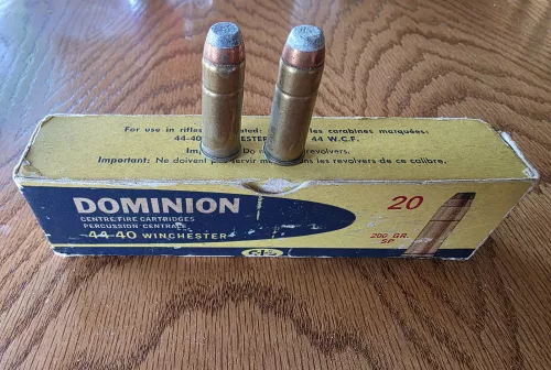 50.00 One box of 20 44-40 Win 200gr sp Antique Dominion Ammo Sep 28, 2025 - 9:41 AM Dennis Selenski On box of 20 44-40Win. Ammo . 200 Win.gr sp Dominion .
