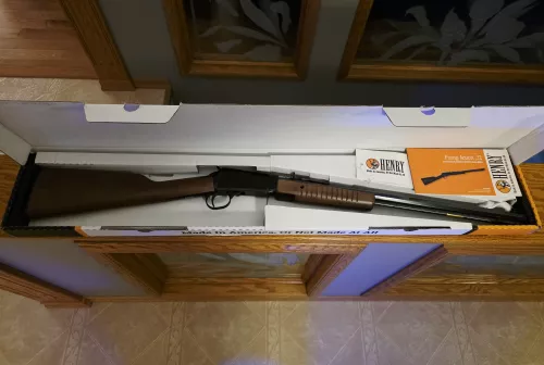 950.00 New Henry pump action & 22 magnum ammunition. Nov 1, 2025 - 4:40 PM Dennis Selenski New henry pump action. Model nos.HOO3TM 19.75 octagon. barrel