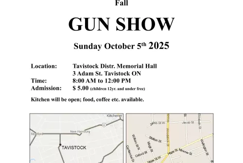 5.00 Tavistock ON. Gunshow Sunday October 5th 2025 8:00 am-noon Sep 4, 2025 - 6:59 PM bertnotebomer Tavistock ON Fall gunshow will be held on Sunday October 5th.