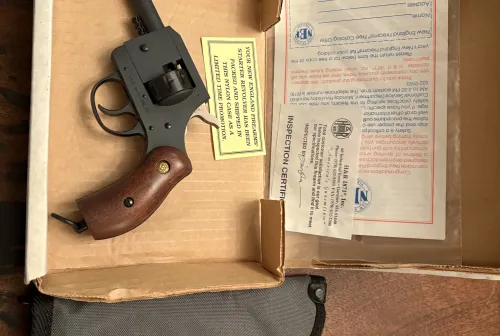 375.00 NEF .22 Cal Blank 9 Shot Starter Pistol Model B22 Feb 10, 2026 - 3:25 PM 3screwsloose NO TRADES. New England Firearms model B22 .22 cal 9 shot blank firing revolver.