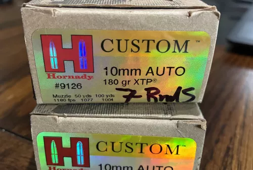 45.00 Hornady custom 10mm auto Sep 22, 2025 - 3:41 PM LFGFX4 27 rounds of Hornady Custom 10mm auto ammo.