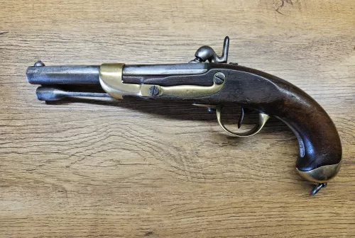 950.00 French 1822 Percussion Pistol, Fully Functional, 69 Cal Oct 13, 2025 - 8:30 AM Menno Very robust, big .69 caliber French Model 1822 percussion pistol. Barrel is just under 8 inches.