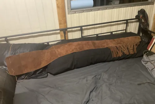 75.00 Leather rifle sleeve with fringe Jan 9, 2026 - 8:07 PM Floppyfrizzen 56 inch leather sleeve 6 inch fold over flap with leather ties.