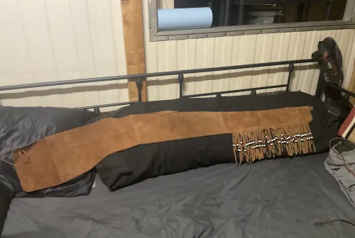75.00 Beaded fringe leather rifle sleeve Jan 9, 2026 - 7:58 PM Floppyfrizzen Fifty inch sleeve. six inch fold over flap with leather ties.