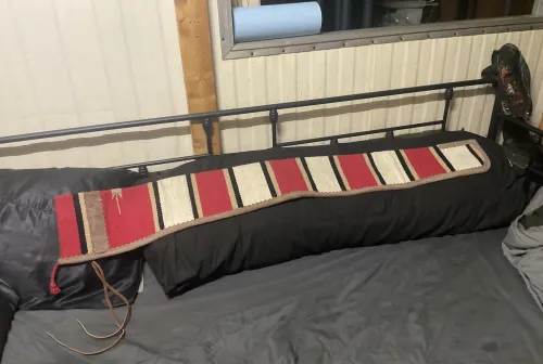 75.00 Saddle blanket gun case Jan 9, 2026 - 8:18 PM Floppyfrizzen Leather trimmed canvas lined with leather ties. Holds scope less rifles up to 49 inches.