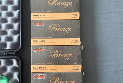 80.00 4.5 boxes of 9mm PMC BRONZE ammunition 115 grain Sep 23, 2025 - 4:34 PM Quick draw bullseye PMC Bronze 9mm 115gr FMJ is widely reviewed as reliable, cost-effective, and accurate for target