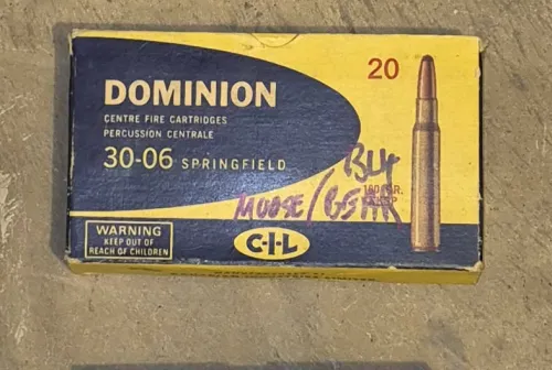 120.00 Various 30-06 and vintage ammo Dec 23, 2025 - 10:02 PM Ammo-bullets 1 box of Dominion 220 gr full box with 1 extra cartridge. - $38