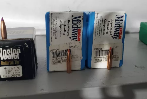 250.00 Nosler 70 gn ballistic tip and repackaged 105 grain hornady amax bullets in .243/6mm Oct 29, 2025 - 5:42 PM Scarab66 250 count box of 70 grain nosler bt in .243 and 200 count of 105 grain repackaged hornady amax in