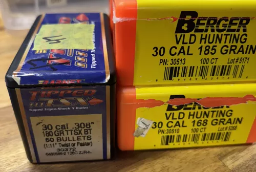 80.00 Berger .30cal bullets various Aug 31, 2025 - 9:37 AM shulsman VLD 185 - 61ct VLD 169 - 50ct Barnes - sold $80 shipped, $75 local
