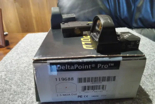 600.00 Leupold Deltapoint Pro and Mount Jan 9, 2026 - 9:40 AM Iner Leupold Deltapoint Pro 2.5 moa with picatinny mount. As new.