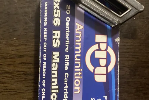 40.00 8x56 RS mannlicher Apr 11, 2026 - 11:59 AM lairdsteele PPU brand, FMJ 13.5g 208gr. Also a German eagle marked clip.