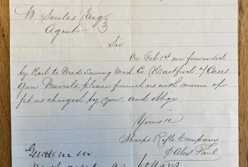 45.00 SHARPS RIFLE COMPANY MEMO DATED 1876 Jan 23, 2026 - 4:44 PM aslarbywetzlar ARMORY AND OFFICE of the SHARPS RIFLE COMPANY LETTER HEAD /MEMO from B