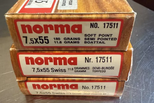 60.00 60 rounds of Norma 7.5x55 - 180grain soft points Sep 13, 2025 - 12:18 PM bryan300wsm 3 full boxes of Norma 7.5 x 55 - 180gr soft point ammo. $60 per box