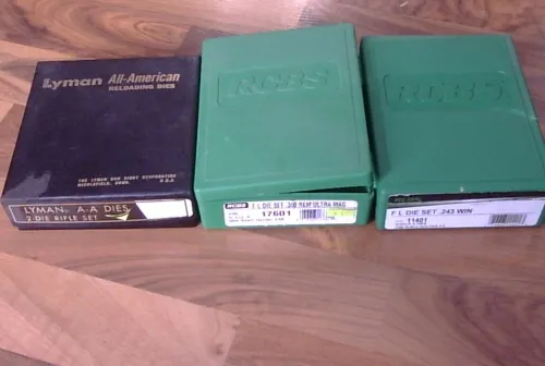 150.00 3 die sets SHIPPING INCLUDED Feb 23, 2026 - 1:30 PM dogface 222 rem.3 dies 300 ultra mag and 243 has 2 dies