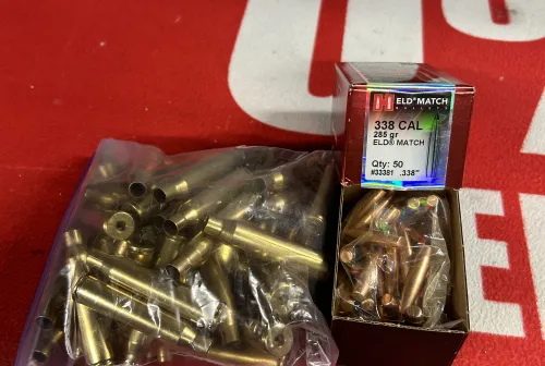 100.00 50x 338 Lapua Mag Brass and Projectiles. Jan 16, 2026 - 10:45 AM wb506 Brass is once fired, de-primed, cleaned and sized. 285gr ELD Match