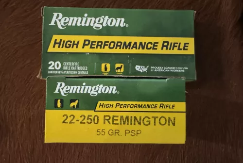 37.50 Remington 22-250 55 grain PSP Nov 20, 2025 - 2:27 PM tank33023114 1.Remington, high performance rifle, 22-250,55 grain pointed soft point, $37.5 per 20
