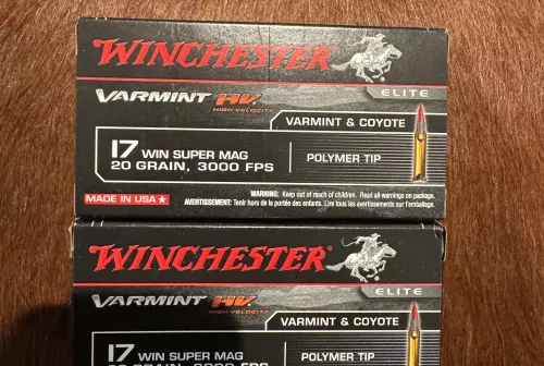 40.00 Winchester 17WSM Nov 18, 2025 - 7:57 AM tank33023114 Winchester Elite Varmint HV(high velocity) , 17 WSM( Win Super Mag), 20 grain polymer tip, 3000 f